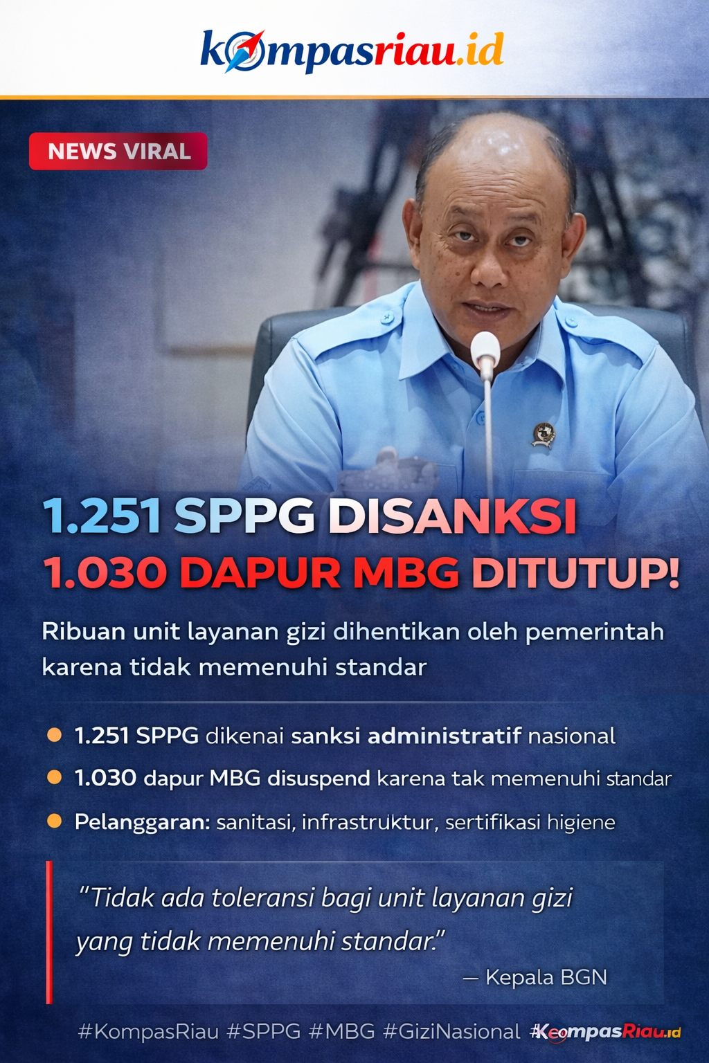 KompasRiau.id – Jakarta, 24 Maret 2026 – Pemerintah melalui Badan Gizi Nasional (BGN) mengambil langkah tegas dengan menjatuhkan sanksi terhadap 1.251 Satuan Pelayanan Pemenuhan Gizi (SPPG) serta menutup sementara 1.030 dapur program Makan Bergizi Gratis (MBG) yang terbukti tidak memenuhi standar. Kebijakan ini menjadi sinyal kuat bahwa pengawasan mutu pangan kini memasuki fase yang lebih ketat demi melindungi kesehatan masyarakat.
