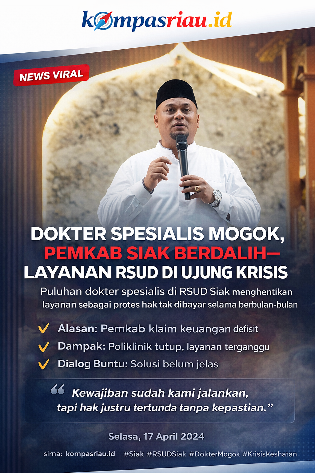 #Siak #RSUDSiak #DokterMogok #KrisisKesehatan #TenagaMedis #PelayananPublik #Riau #BeritaRiau #KompasRiauID #NewsUpdate #ViralHariIni #FaktaLapangan #KesehatanIndonesia