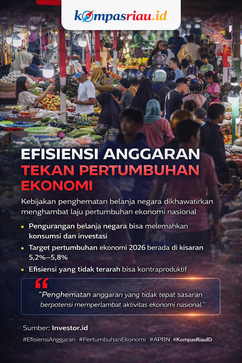 KompasRiau.id – Jakarta, 24 Maret 2026 – Kebijakan efisiensi anggaran pemerintah berpotensi menahan laju pertumbuhan ekonomi nasional di tengah upaya menjaga stabilitas fiskal. Sejumlah ekonom menilai, pengurangan belanja negara yang tidak terukur dapat melemahkan daya dorong ekonomi, terutama pada sektor-sektor yang bergantung pada realisasi anggaran pemerintah.
