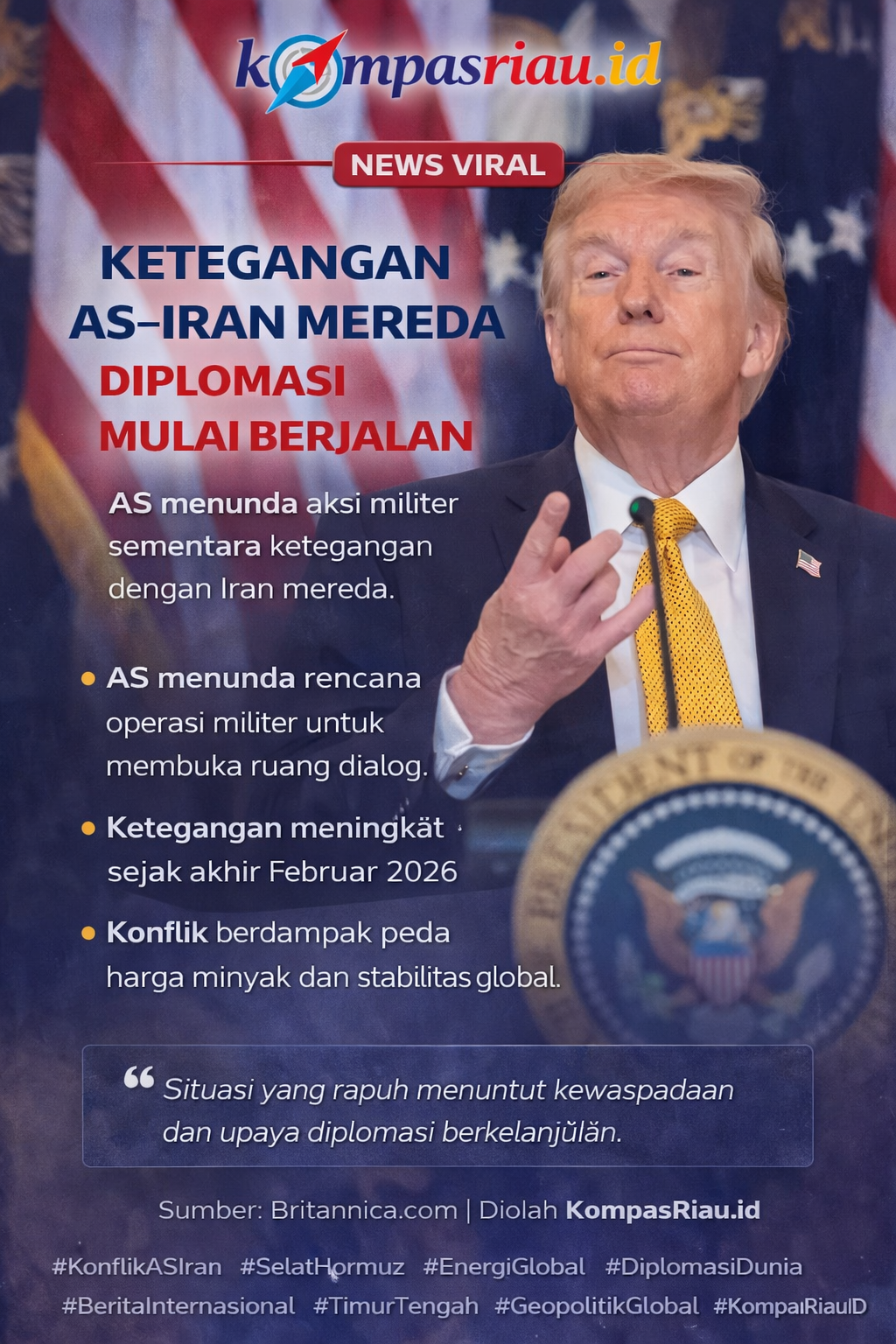 KompasRiau.id – Washington, 24 Maret 2026 – Ketegangan militer antara Amerika Serikat dan Iran yang sempat memicu kekhawatiran perang besar di kawasan Timur Tengah dilaporkan mulai mereda untuk sementara waktu. Situasi ini terjadi setelah sejumlah langkah diplomasi dan penundaan aksi militer dilakukan oleh pihak-pihak terkait, meskipun kondisi keamanan regional masih dinilai sangat rentan.