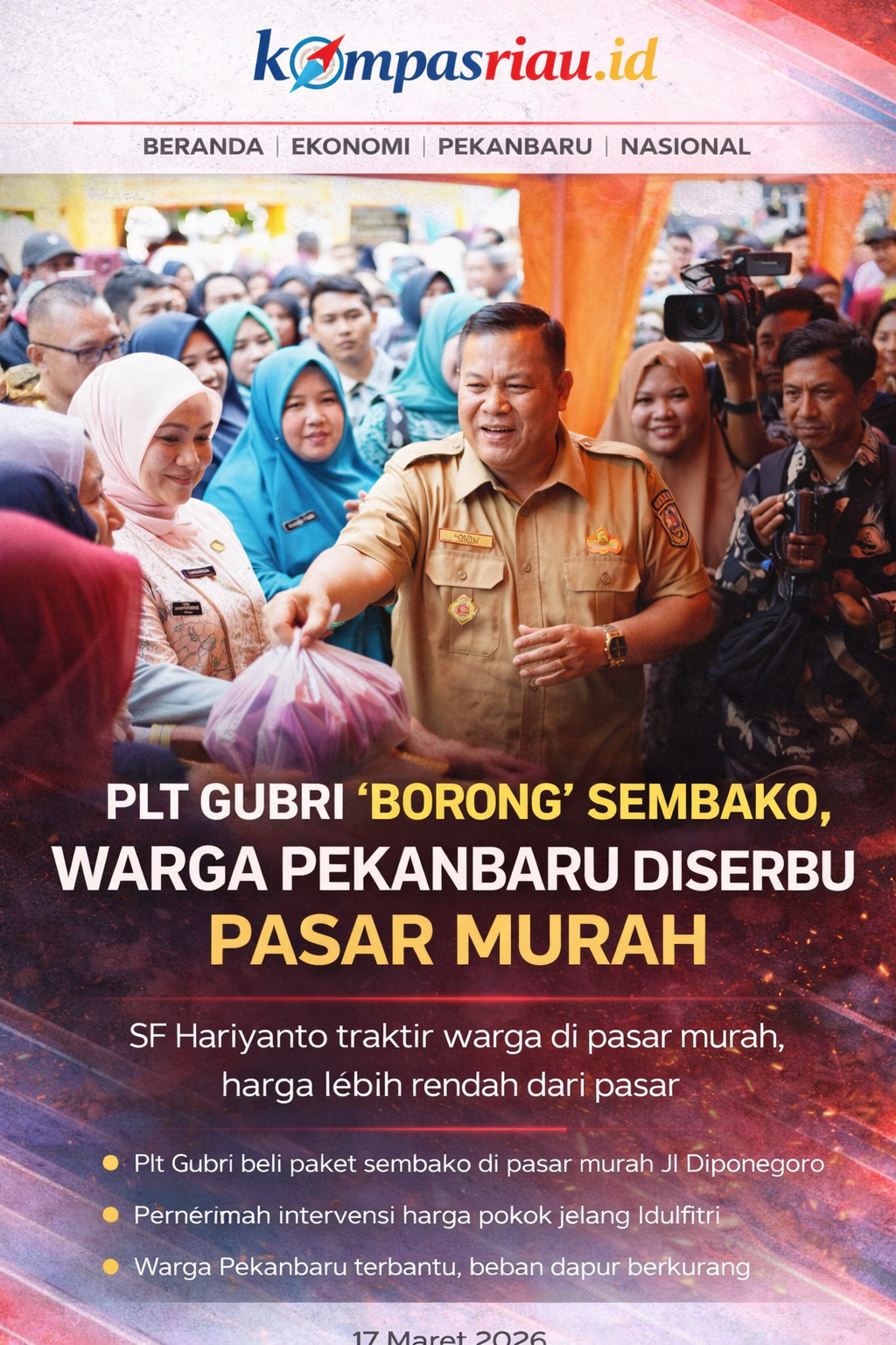 PEKANBARU – Di tengah tekanan harga kebutuhan pokok jelang Lebaran, langkah tak biasa ditunjukkan Pelaksana Tugas (Plt) Gubernur Riau, SF Hariyanto. Ia tak sekadar membuka pasar murah—tetapi langsung “mentraktir” warga dengan membeli paket sembako untuk dibagikan.