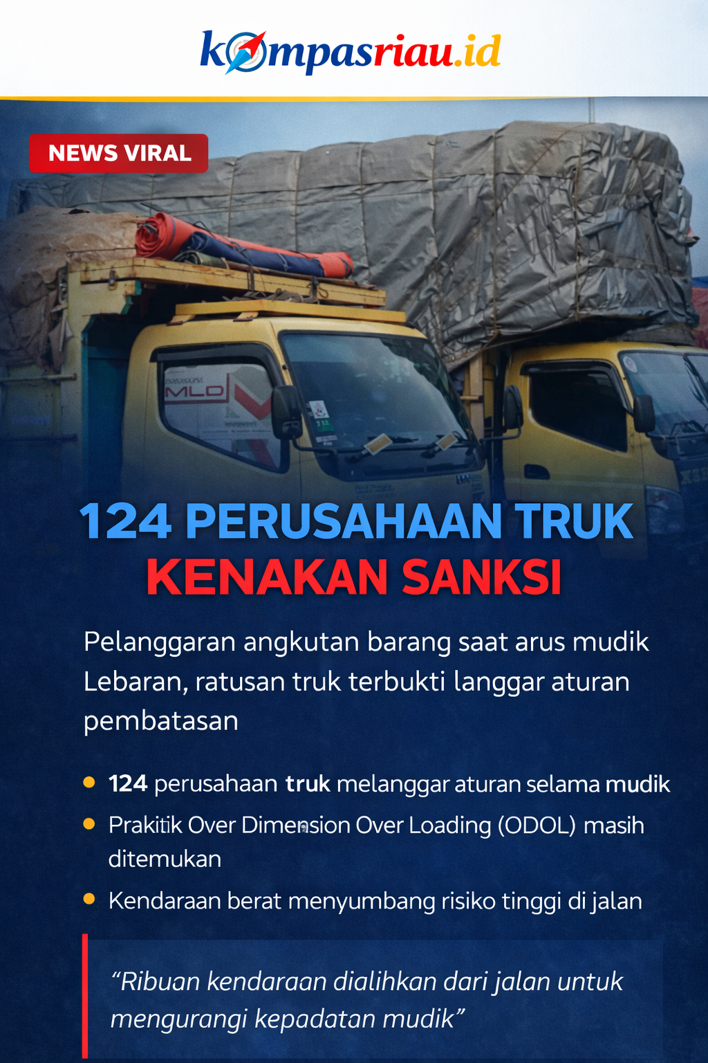 KompasRiau.id – Jakarta, 24 Maret 2026 – Pemerintah melalui Kementerian Perhubungan mengambil langkah tegas terhadap pelanggaran angkutan barang selama arus mudik Lebaran 1447 Hijriah. Sebanyak 124 perusahaan truk terbukti melanggar aturan pembatasan operasional, termasuk praktik Over Dimension Over Loading (ODOL) yang dinilai berisiko tinggi terhadap keselamatan pengguna jalan dan kelancaran lalu lintas nasional.