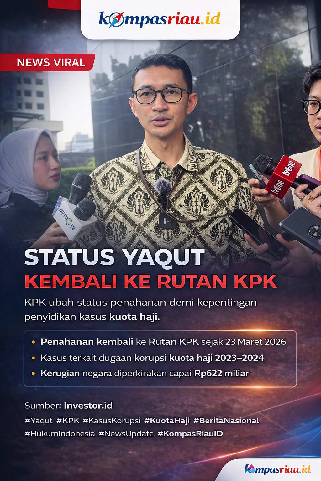 KompasRiau.id – Jakarta, 24 Maret 2026 – Komisi Pemberantasan Korupsi (KPK) kembali mengalihkan status penahanan mantan Menteri Agama, Yaqut Cholil Qoumas, dari tahanan rumah menjadi tahanan Rumah Tahanan (Rutan) KPK. Langkah ini diambil sebagai bagian dari kebutuhan penyidikan dalam kasus dugaan korupsi kuota haji yang masih berlangsung.