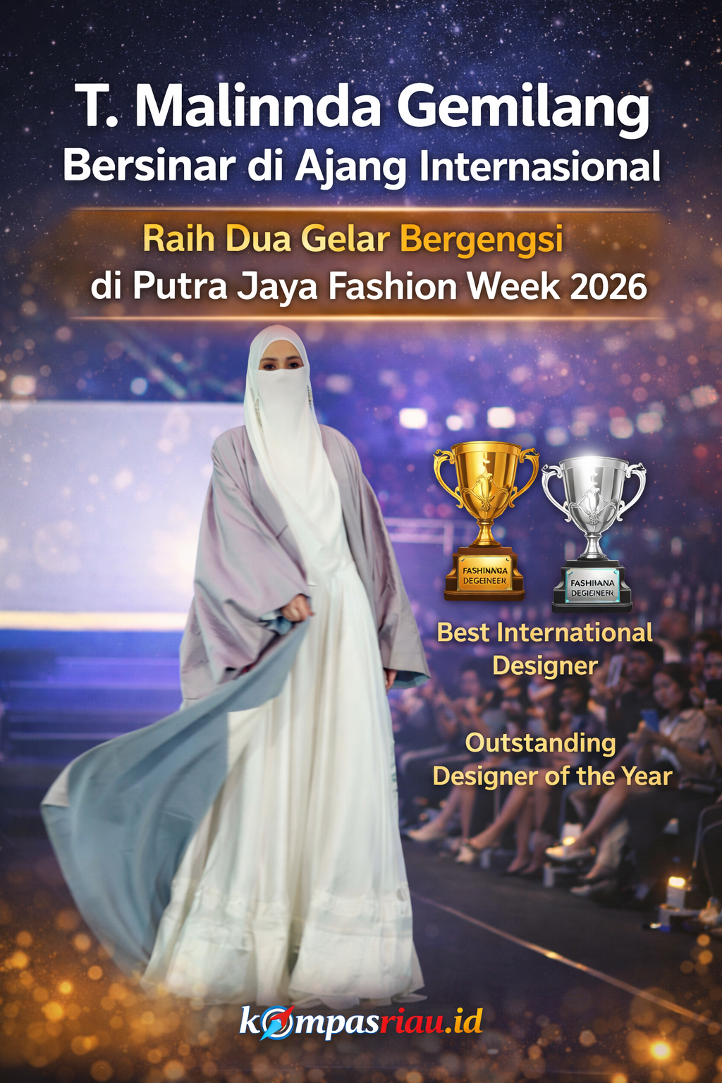 PEKANBARU — Perancang busana sekaligus entrepreneur asal Riau, T. Malinnda Gemilang, kembali mengharumkan nama daerah di kancah internasional. Ia sukses meraih dua penghargaan bergengsi dalam ajang International Gema Raya Putra Jaya Fashion Week 2026 yang digelar di Malaysia. (cakaplah.com)