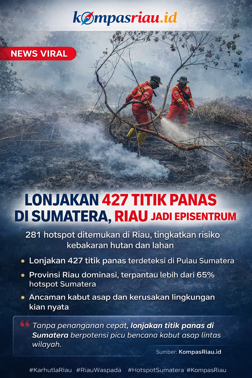KompasRiau.id – Riau, 23 Maret 2026 – Pulau Sumatera kembali diwarnai kekhawatiran akibat peningkatan titik panas (hotspot) yang signifikan. Data satelit terbaru menunjukkan, dari 427 titik panas yang terpantau di seluruh Sumatera, 281 berada di Provinsi Riau. Angka ini menjadikan Riau sebagai provinsi dengan konsentrasi hotspot tertinggi, memicu kewaspadaan terhadap potensi kebakaran hutan dan lahan.