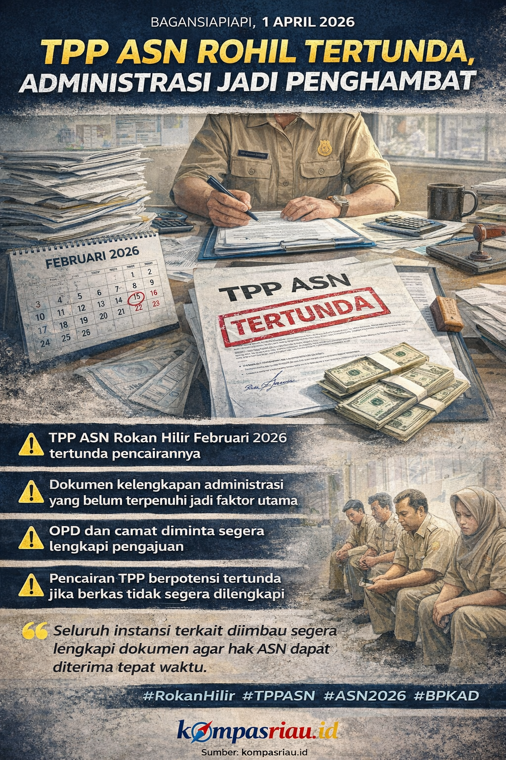 Tambahan Penghasilan Pegawai (TPP) Aparatur Sipil Negara (ASN) di Kabupaten Rokan Hilir hingga awal April 2026 belum juga cair untuk periode Februari. Keterlambatan ini memicu perhatian serius, mengingat tunjangan tersebut merupakan bagian penting dari penghasilan ASN yang berdampak langsung pada stabilitas ekonomi pegawai.