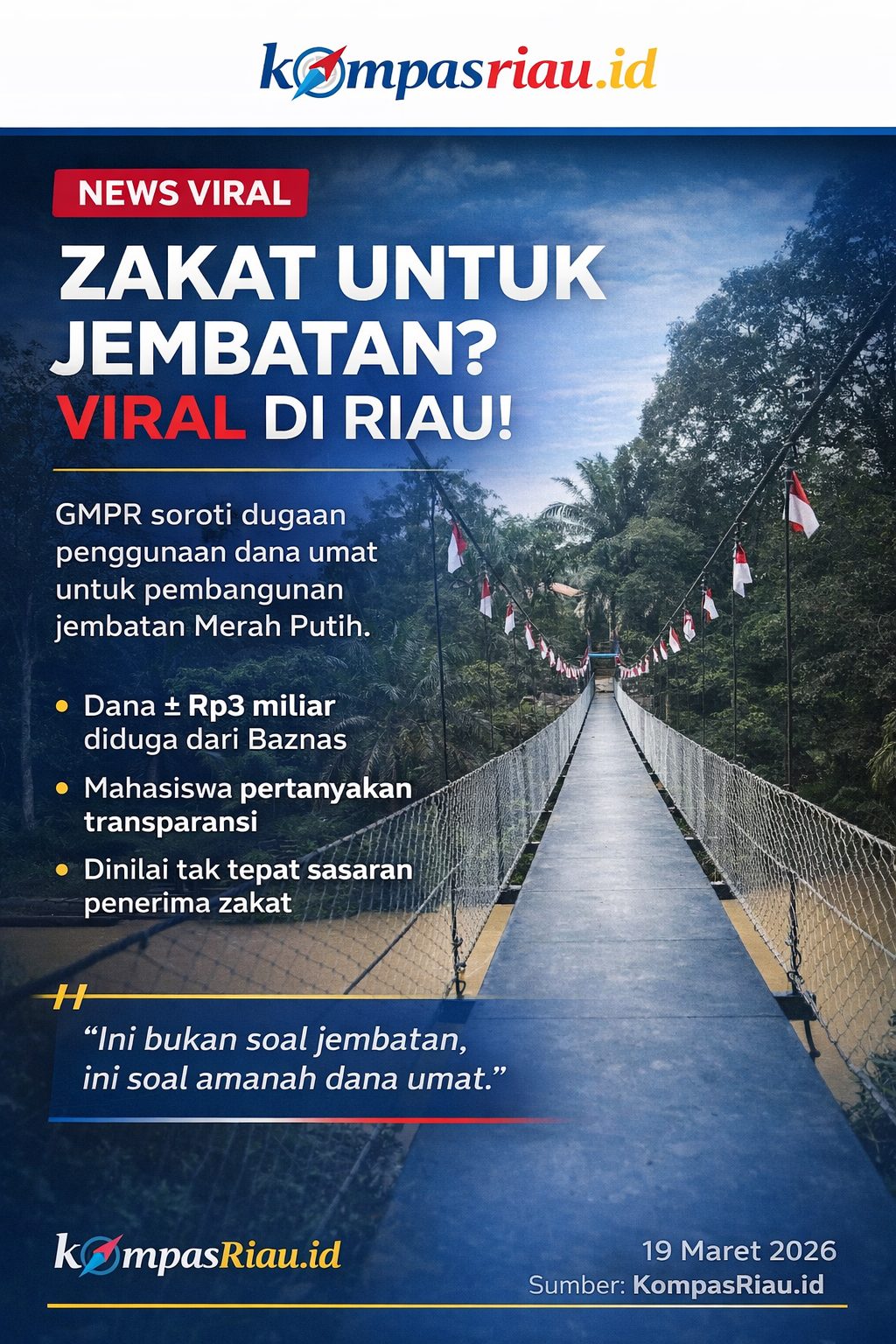 Gerakan Mahasiswa Pemuda Peduli Riau (GMPR) melontarkan kritik keras terhadap dugaan penggunaan dana zakat untuk pembangunan Jembatan Merah Putih Presisi. Nilainya tidak kecil—sekitar Rp3 miliar. Namun bagi GMPR, yang dipersoalkan bukan angka, melainkan arah moral dan hukum di balik kebijakan itu. (Haluan Riau)